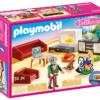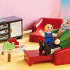 Σαλόνι κουκλόσπιτου με τζάκι (λειτουργεί με 2 μπαταρίες AAA – δεν περιλ.), καναπέ-κρεβάτι, πολυθρόνα και μπουφέ.