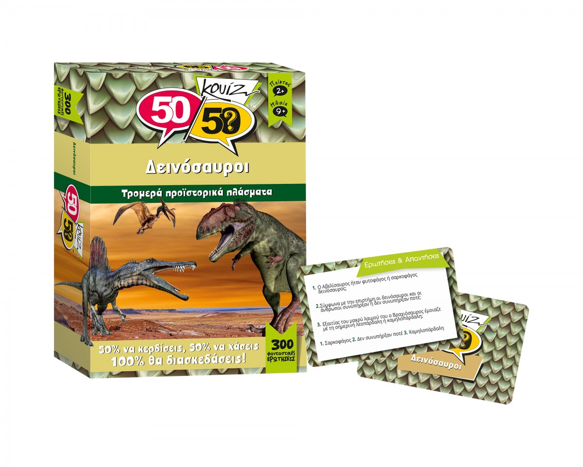 Ο Τυραννόσαυρος Ρεξ είχε περίπου 60 ή 40 δόντια που το καθένα είχε μήκος περίπου 30 εκατοστά; Ο Κεντρόσαυρος ήταν φυτοφάγος ή σαρκοφάγος δεινόσαυρος; Ταξίδεψε στην εποχή των δεινοσαύρων και γνώρισε τα τρομερά προϊστορικά πλάσματα! Τέσταρε τις γνώσεις σου και συναγωνίσου τους φίλους σου με το νέο επιτραπέζιο παιχνίδι ερωτήσεων 50-50 Κουίζ Δεινόσαυροι! Με 300 ερωτήσεις που καλύπτουν ποικίλα θέματα, μαθαίνεις τις πιο ενδιαφέρουσες και αξιοπερίεργες πληροφορίες για τους δεινόσαυρους.