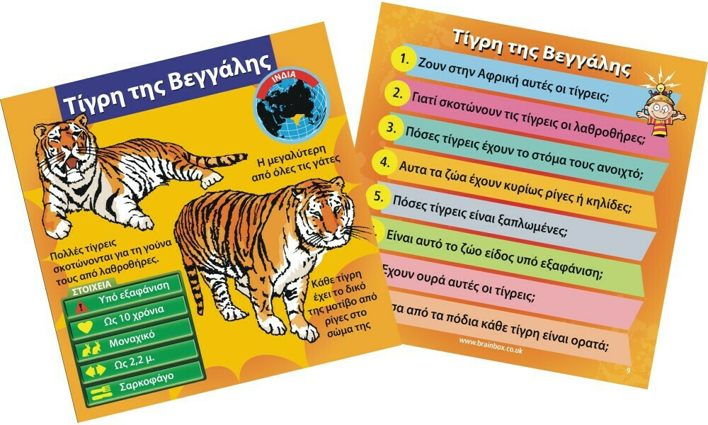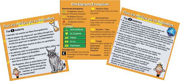 Εξερεύνησε το ζωικό βασίλειο με τον πιο διασκεδαστικό τρόπο! Διάλεξε μια κάρτα, αναποδογύρισε την κλεψύδρα και προσπάθησε να τη μάθεις απ’ έξω μέσα σε 10 δευτερόλεπτα! Τώρα ρίξε το ζάρι και απάντα στην αντίστοιχη ερώτηση. Αν απαντήσεις σωστά κρατάς την κάρτα, αν απαντήσεις λάθος βάζεις την κάρτα και πάλι μέσα στο BrainBox.