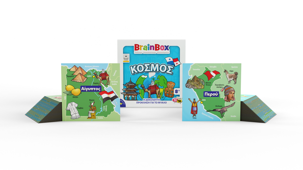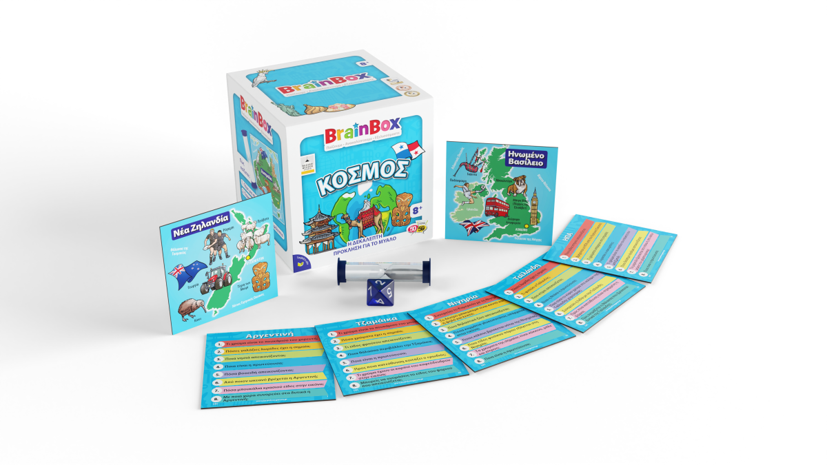 Εξερεύνησε όλες τις χώρες του κόσμου από το σπίτι σου! Διάλεξε μια κάρτα μέσα από το BrainBox. Αναποδογύρισε την κλεψύδρα και προσπάθησε να μάθεις απ’ έξω την κάρτα σε 10 δευτερόλεπτα! Τώρα ρίξε το ζάρι και απάντησε στην αντίστοιχη ερώτηση. Αν απαντήσεις σωστά κρατάς την κάρτα, αν απαντήσεις λάθος βάζεις την κάρτα πάλι μέσα στο BrainBox.