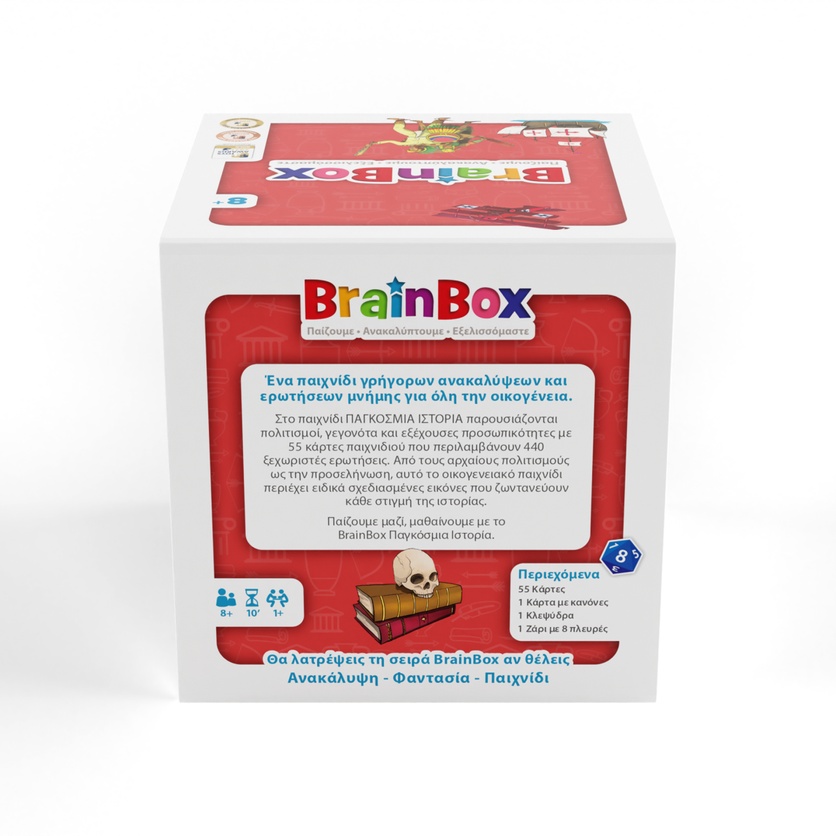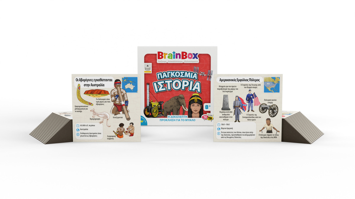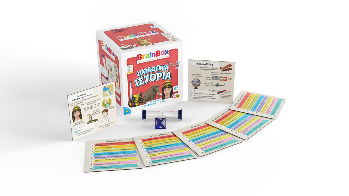 Μάθε για τα πιο συναρπαστικά γεγονότα της παγκόσμιας ιστορίας! Διάλεξε μια κάρτα μέσα από το BrainBox. Αναποδογύρισε την κλεψύδρα και προσπάθησε να μάθεις απ’ έξω την κάρτα σε 10 δευτερόλεπτα! Τώρα ρίξε το ζάρι και απάντησε στην αντίστοιχη ερώτηση. Αν απαντήσεις σωστά κρατάς την κάρτα, αν απαντήσεις λάθος βάζεις την κάρτα πάλι μέσα στο BrainBox.