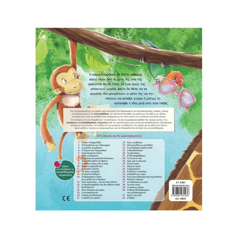 Το βιβλίο: Η καμηλοπάρδαλη δε βλέπει καθαρά. Όταν τα ζώα όμως της φτιάχνουν γυαλιά, εκείνη δε θέλει να τα φορέσει. Θα μπορέσουν οι φίλοι της να την πείσουν να αλλάξει γνώμη ή μήπως το καταλάβει η ίδια μετά από όσα πάθει;