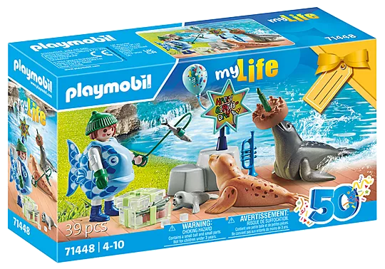 Το συγκεκριμένο σετ δεν είναι απλώς ένα παιχνίδι- είναι ένα πάρτι μέσα σε ένα μαγικό κουτί. Μην χάνετε χρόνο, ελάτε να γιορτάσουμε τα αγαπημένα θαλάσσια ζώα. Εδώ, οι φώκιες γιορτάζουν τα γενέθλιά τους και η φροντιστής τους είναι ντυμένη ψάρι, εξοπλισμένη με τρομπέτα για μια μεγάλη είσοδο. Χρησιμοποιώντας ένα καλάμι ψαρέματος, ταΐζει τις φώκιες μια μεγάλη ποσότητα ψαριών, που αποθηκεύει σε ένα ψυγείο, μαζί με έναν γιγαντιαίο σολωμό. Πρωταγωνιστής της παράστασης είναι ένα θαλάσσιο λιοντάρι, το οποίο μπορεί να ισορροπεί μια τούρτα γενεθλίων στη μύτη του. Τόσο το θαλάσσιο λιοντάρι όσο και η φώκια έχουν κεφάλια και πτερύγια που κινούνται κάνοντας την παράσταση ακόμα πιο εντυπωσιακή. Με ειδικό ταμπελάκι για ευχές πάνω στο κουτί.