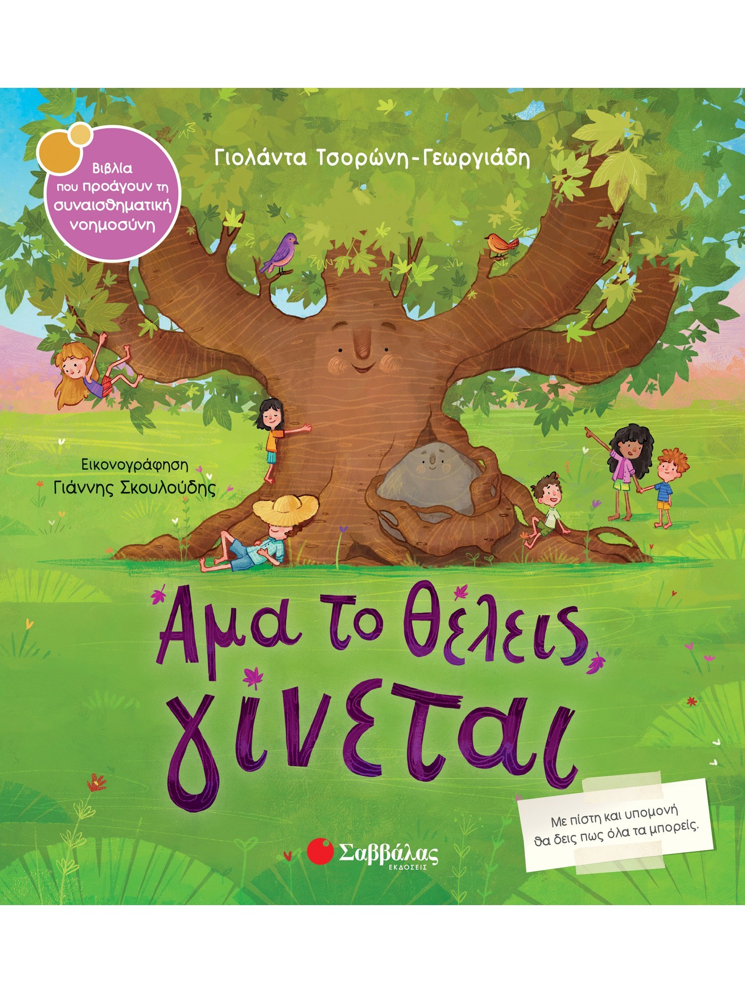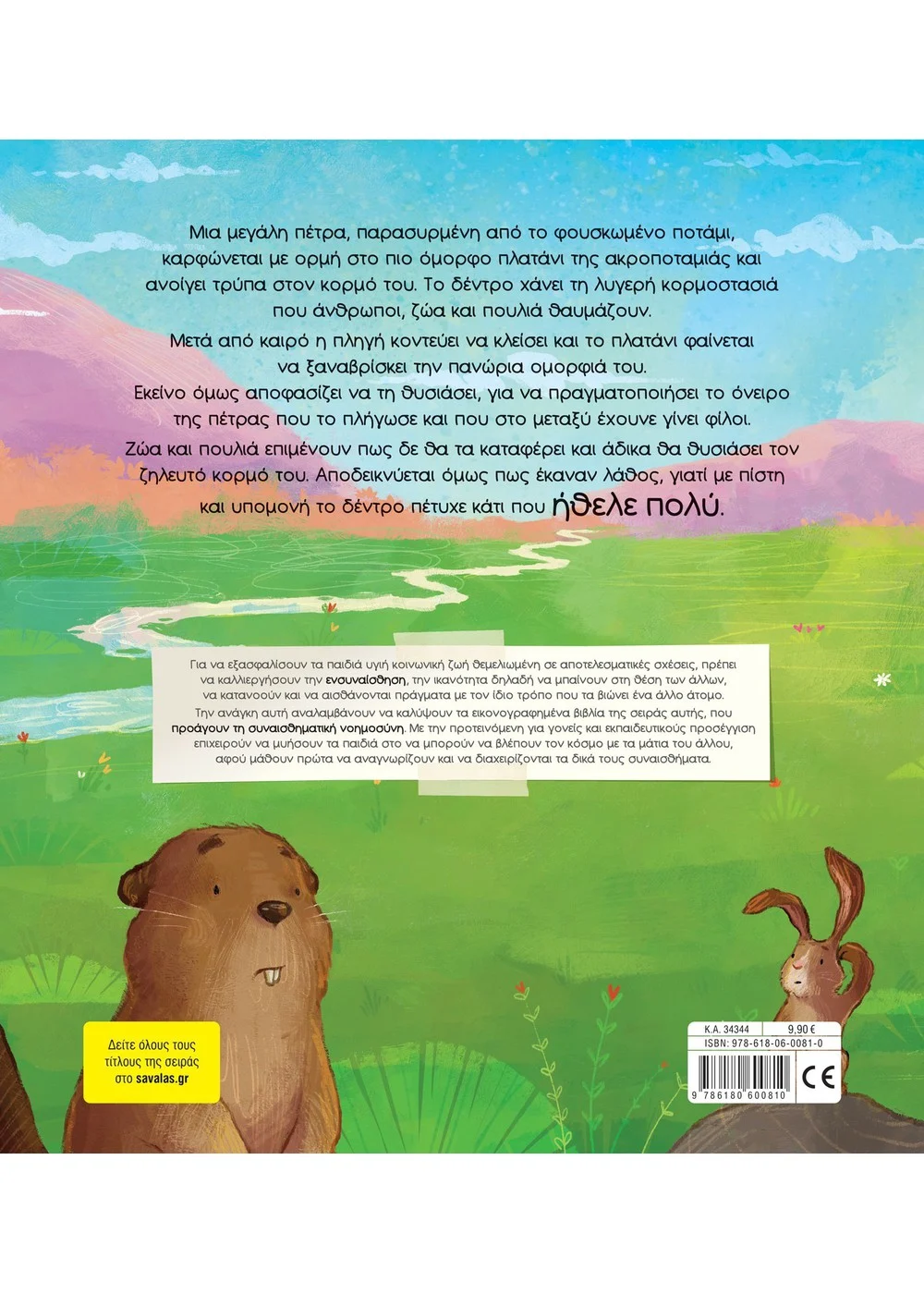Το βιβλίο: Μια μεγάλη πέτρα, παρασυρμένη από το φουσκωμένο ποτάμι, καρφώνεται με ορμή στο πιο όμορφο πλατάνι της ακροποταμιάς και ανοίγει τρύπα στον κορμό του. Το δέντρο χάνει τη λυγερή κορμοστασιά που άνθρωποι, ζώα και πουλιά θαυμάζουν. Μετά από καιρό η πληγή κοντεύει να κλείσει και το πλατάνι φαίνεται να ξαναβρίσκει την πανώρια ομορφιά του. Εκείνο όμως αποφασίζει να τη θυσιάσει, για να πραγματοποιήσει το όνειρο της πέτρας που το πλήγωσε και που στο μεταξύ έχουνε γίνει φίλοι. Ζώα και πουλιά επιμένουν πως δε θα τα καταφέρει και άδικα θα θυσιάσει τον ζηλευτό κορμό του. Αποδεικνύεται όμως πως έκαναν λάθος, γιατί με πίστη και υπομονή το δέντρο πέτυχε κάτι που ήθελε πολύ.